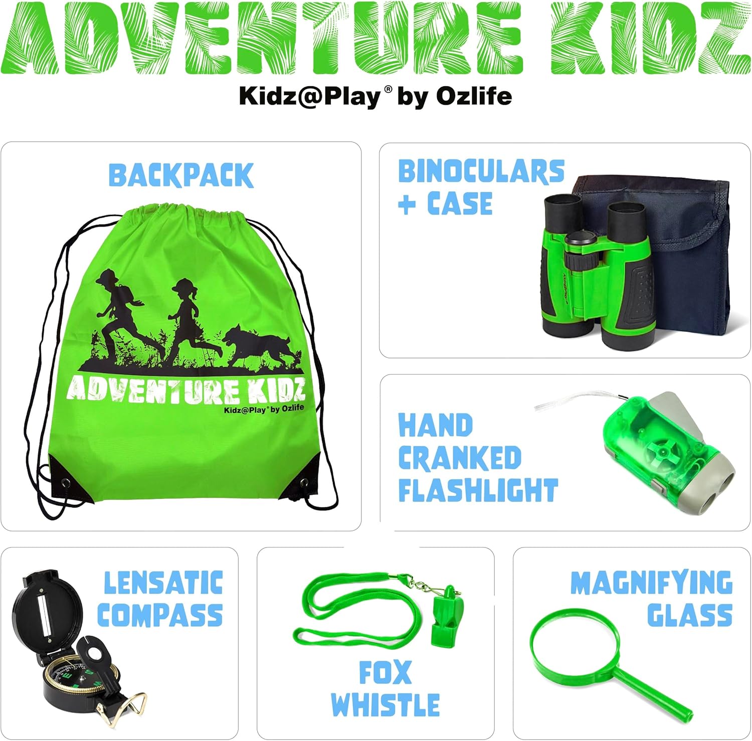 Adventure Kidz Outdoor Exploration Kit, Children’s Binoculars with Case, Flashlight, Compass, Whistle, Magnifying Glass, Backpack. Great Kids Gift Set for Camping, Hiking, STEM and Pretend Play
