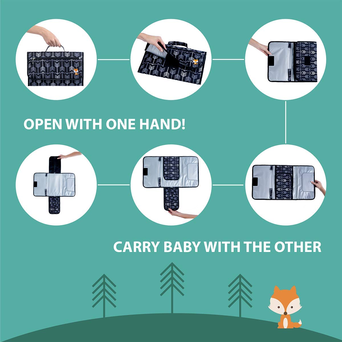- OUTFOXES THE REST: The Lil Fox Portable Changing Pad is made with water-wicking 300D PU on the outside and Waterproof PEVA on the inside, making it easy to wipe clean. It comes in a stylish arrow print design that moms and dads can proudly show off. It also makes a perfect gender-neutral Baby Shower Gift for Baby girls or boys. When folded, it measures 13.8 x 8.4" and can fit in any bag or Diaper backpack. It also has a Diaper clutch strap for easy attachment to your stroller, wrist, or toys.