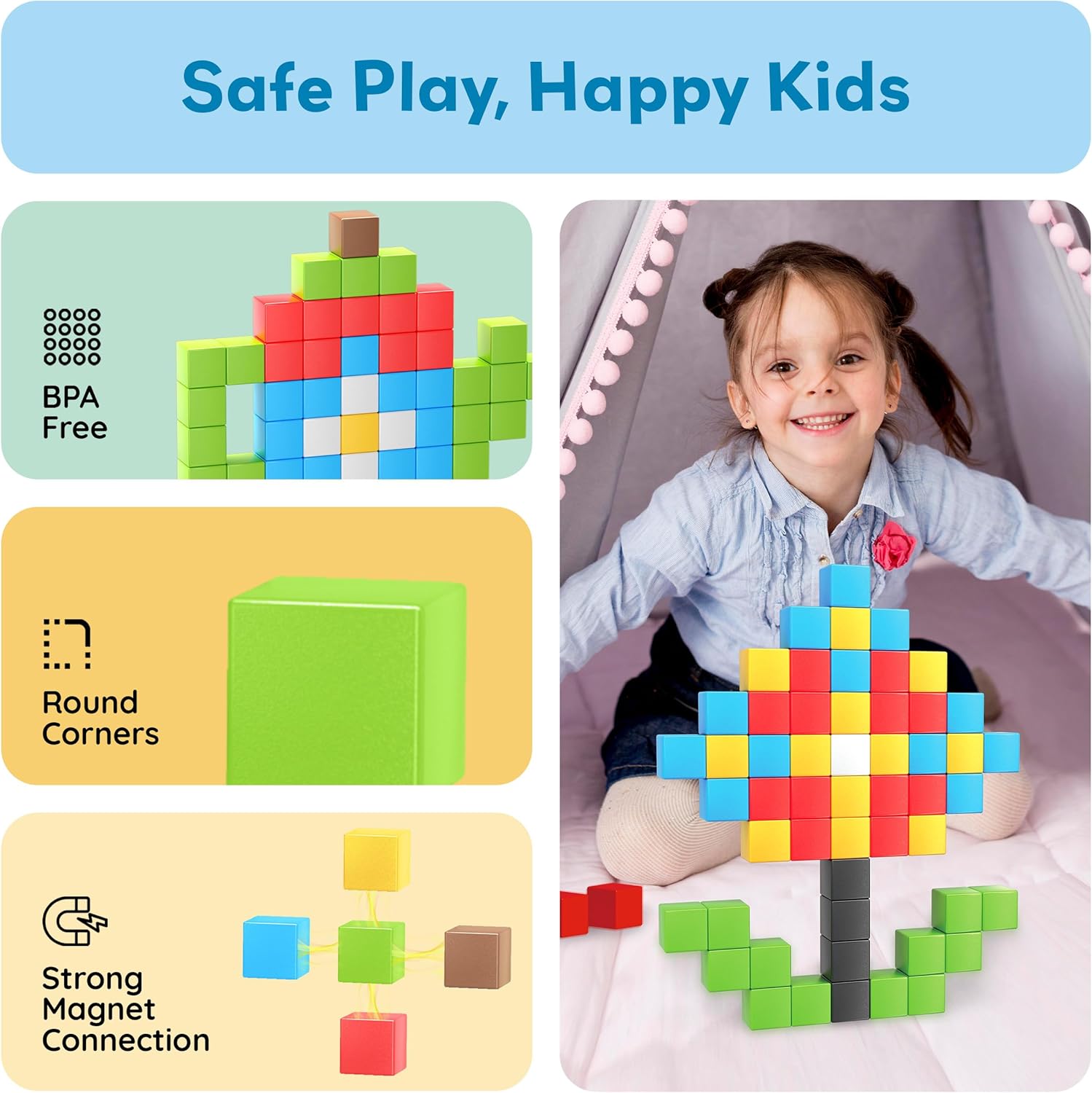 - CREATIVE LEARNING WITH 60 MAGNETIC CUBES: This 60-piece set of 1 inch magnetic building cubes features click-to-connect magnets for intuitive 3D design. Kids develop creativity, fine motor skills, spatial awareness, and STEM thinking through hands-on puzzle play. From towers to animals, each build promotes problem solving, logic, and coordination while encouraging open-ended exploration and early childhood brain development.