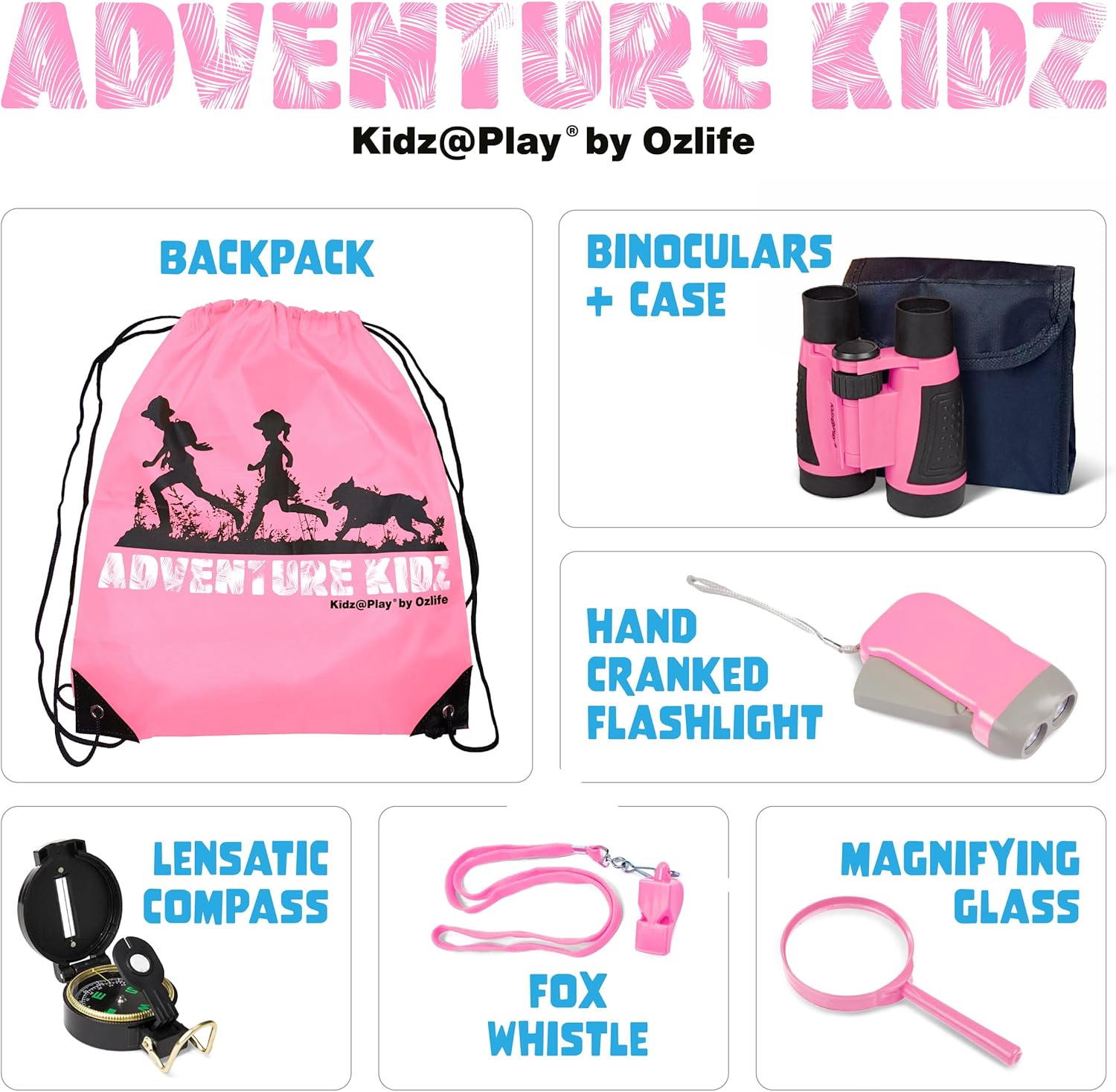 Adventure Kidz - Outdoor Exploration Kit, Children’s Toy Binoculars with Case, Flashlight, Compass, Fox Whistle, Magnifying Glass, Backpack. Great Gift Set for STEM, Pretend Play. Age 3+