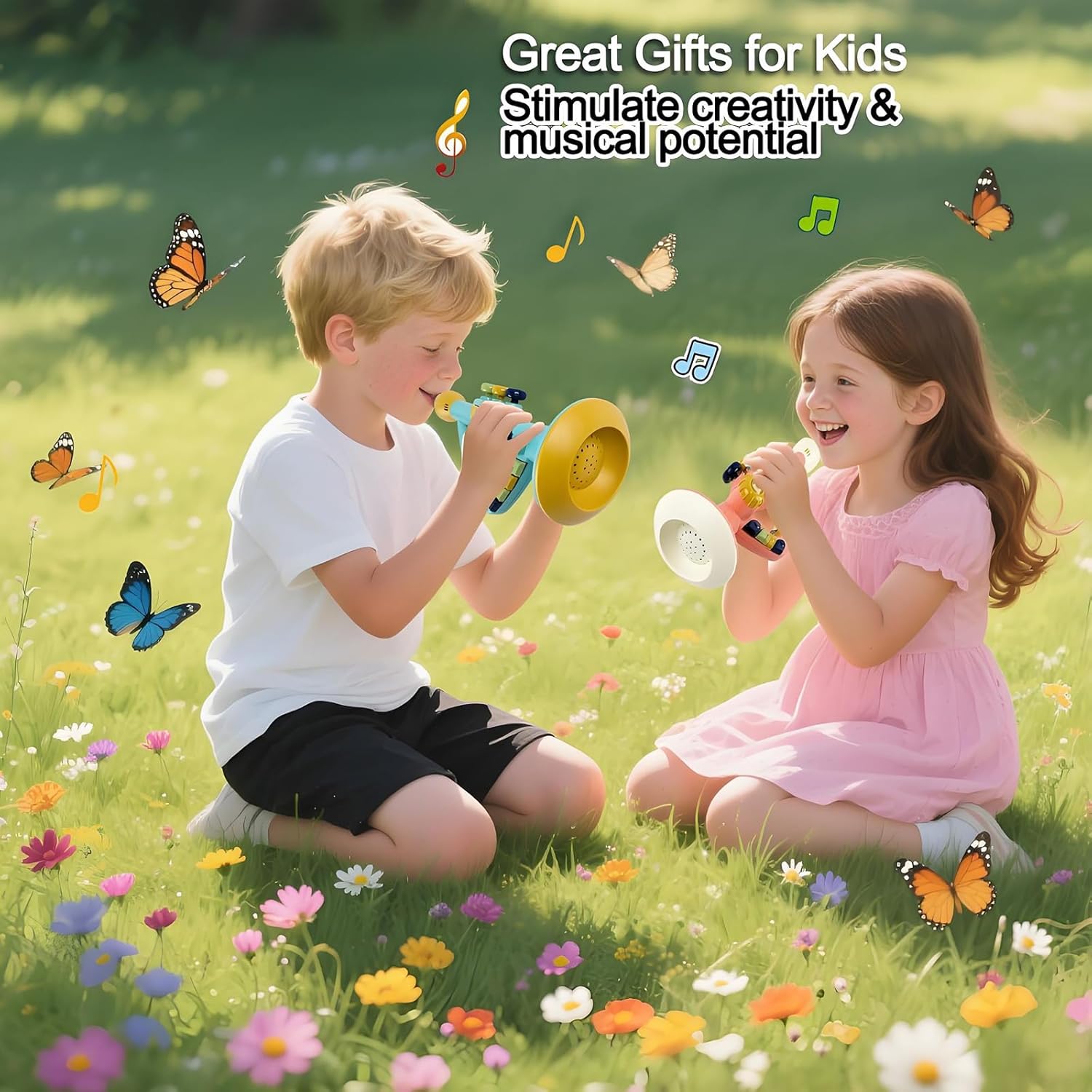 - Multifunction little trumpet toy, which is with 12 musical instrument mode, 3 note buttons, colorful flashing lights, adjustable loudness. It can automatically play the pre-recorded cool melodies. You can also manually play lovely melodies by pressing the note buttons and blow the trumpet.
