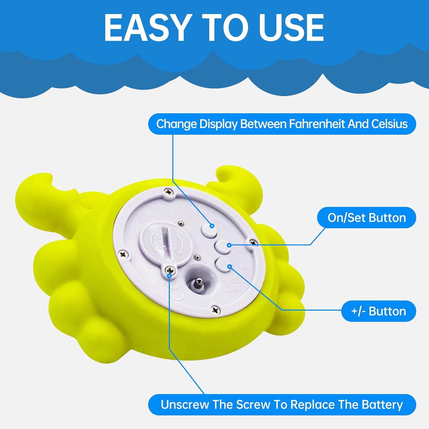 - Cute Design: Meet our cute crab bath and room thermometer. This handy crab thermometer makes bath time super safe so you and your baby can have lots of fun without the worry.