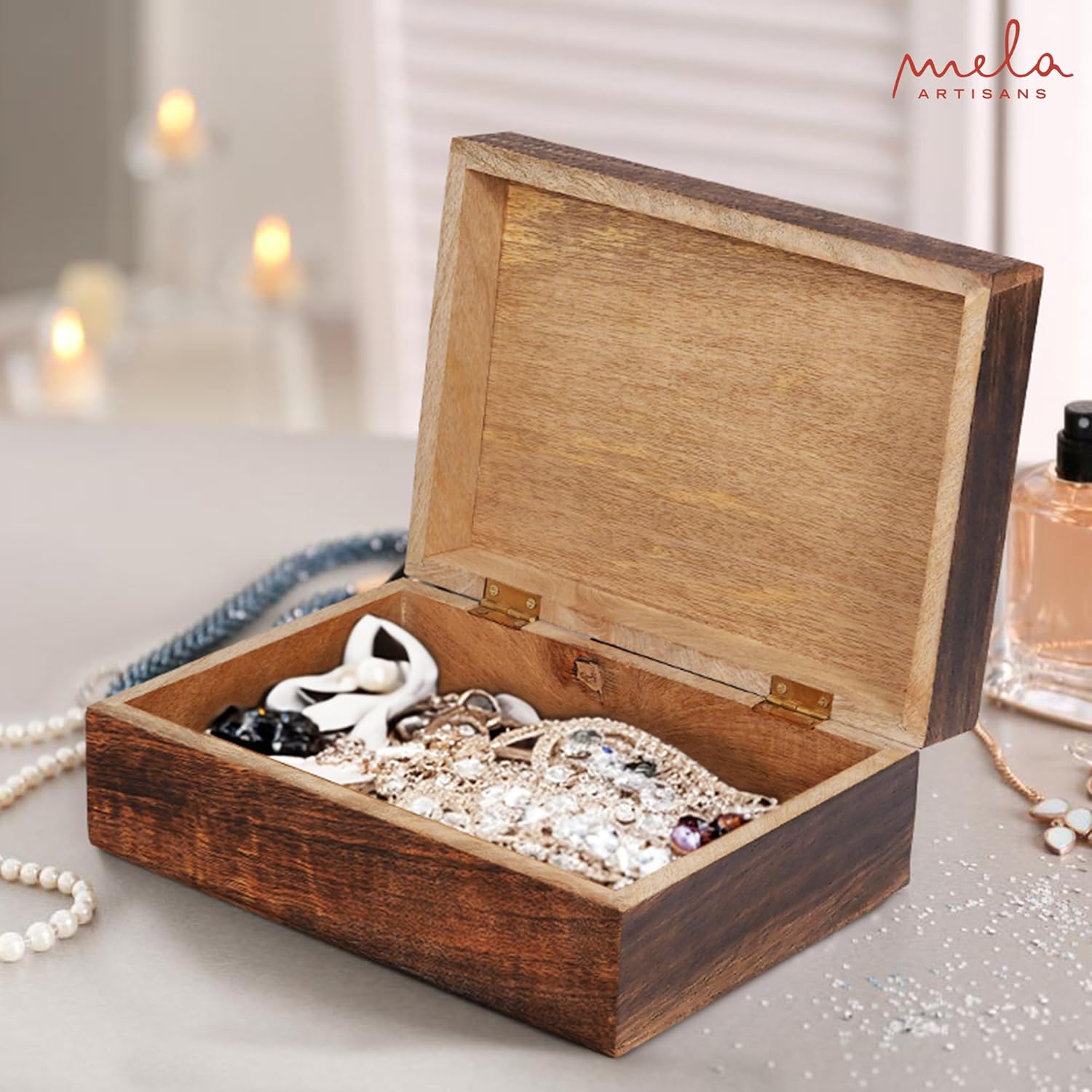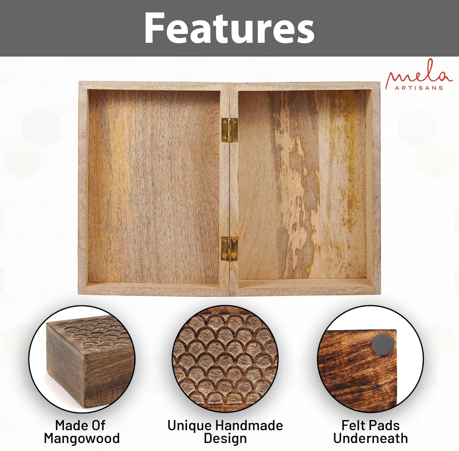 - Sustainable Mango Wood: Mela Artisans have worked hard & crafted these decorative photo storage boxes as an Earth-friendly storage solution for your keys, house essentials, & more. Our extra large decorative box with lid is crafted from 100% real Mango wood & features a hinged lid so you don’t have to fumble with a lid when securing or removing it.