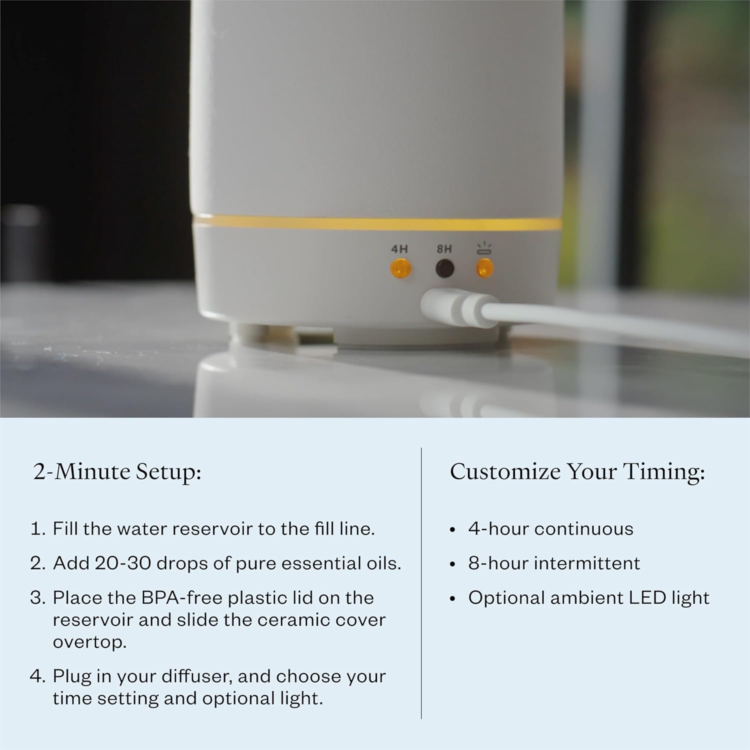 - This ceramic essential oil diffuser comes equipped with 4-hour and 8-hour run times. The 4 hour mode runs consistently while the 8 hour mode is an intermittent setting. This setting runs for 30 seconds on then 30 seconds off to extend the scent for longer.