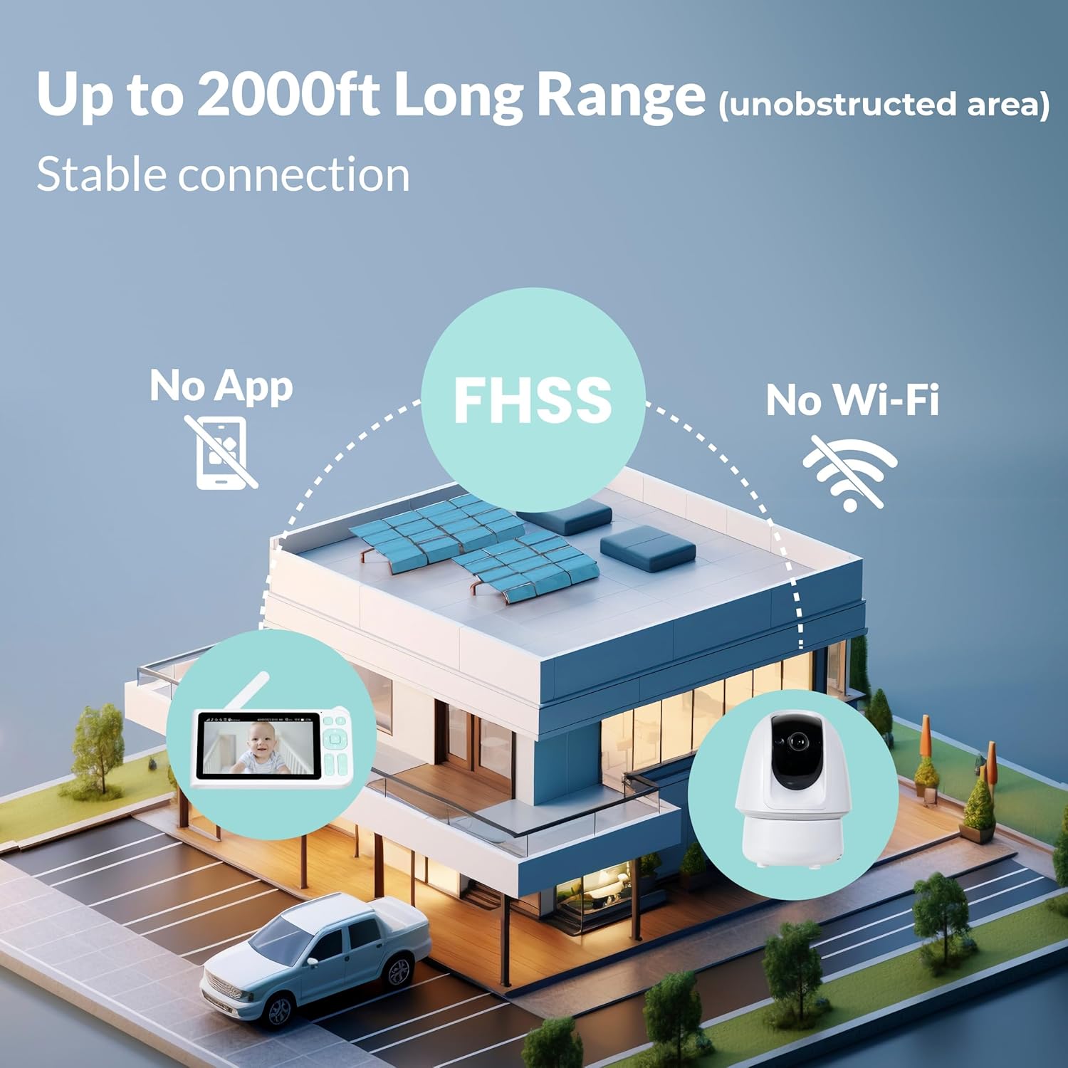 - Extended 2000ft Long Range: With a connectivity range of up to 2000 feet (In open areas without obstructions, the maximum distance), you can move freely within a larger area of your home without worrying about losing connection to your baby's room.