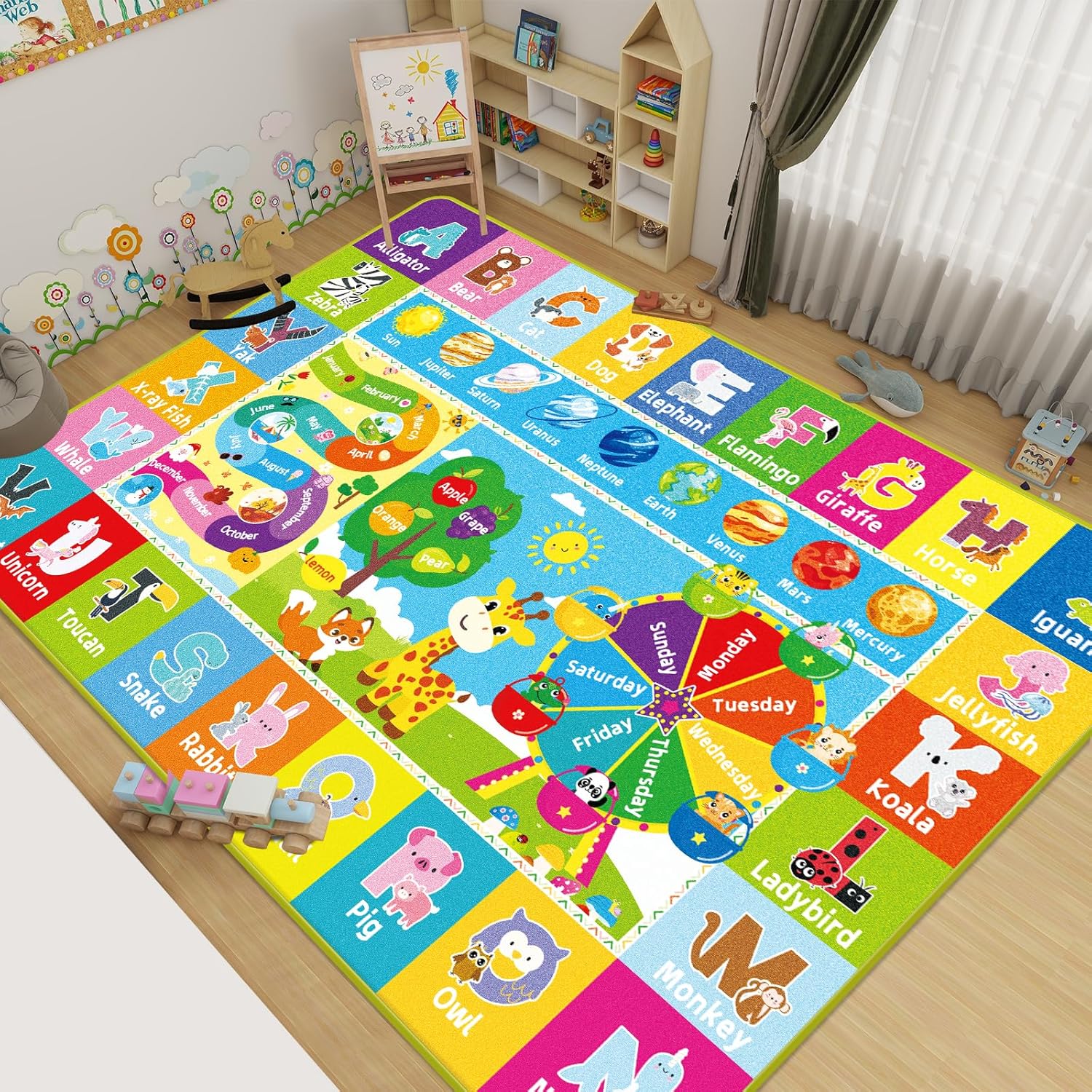 - Fun & Educational Design: Designed to engage and educate, this playroom rug introduces children to a variety of topics including animals, colors, shapes, numbers, seasons, and more. Its vibrant, eye-catching illustrations stimulate your child’s cognitive development and foster early learning through play, making it an enjoyable experience for both fun and education.