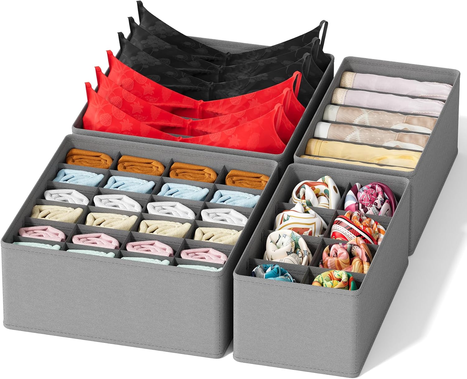 - Mult-use: 4 bins can be make smaller or larger storage parts to stay organized and save space; Sort clothing, baby clothes, bra, socks, underwears, scarves, tools, cutlery, medicine, vitamins, jewelry, makeup and much more.