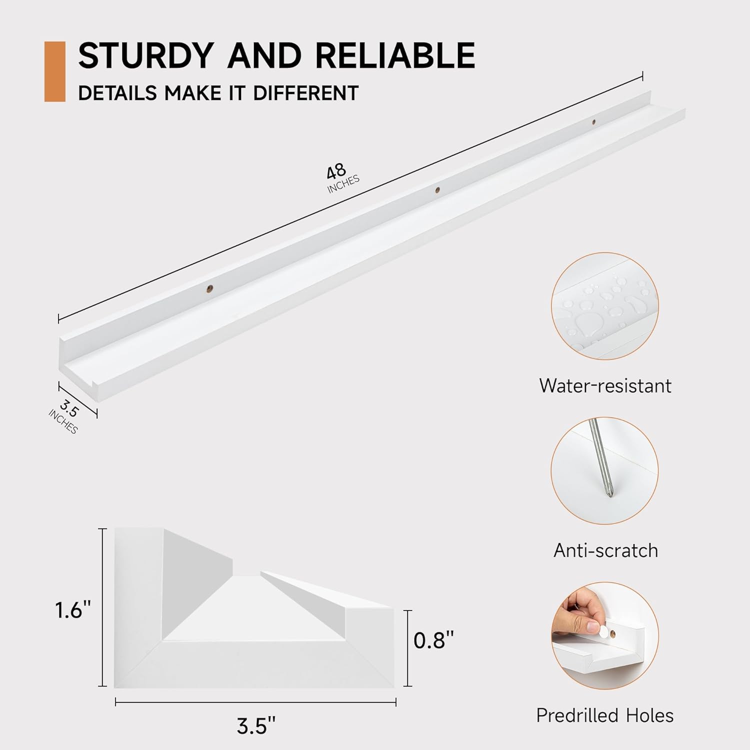 - 3.5" PICTURE LEDGE DESIGN: Ideal for displaying photos, artwork, or collectibles, these feature a thoughtful extremely narrow 3.5-inch width ledge design to prevent items from sliding forward, its mounting holes are spaced 16 inches apart for secure mounting to wall studs uncluttered aesthetic