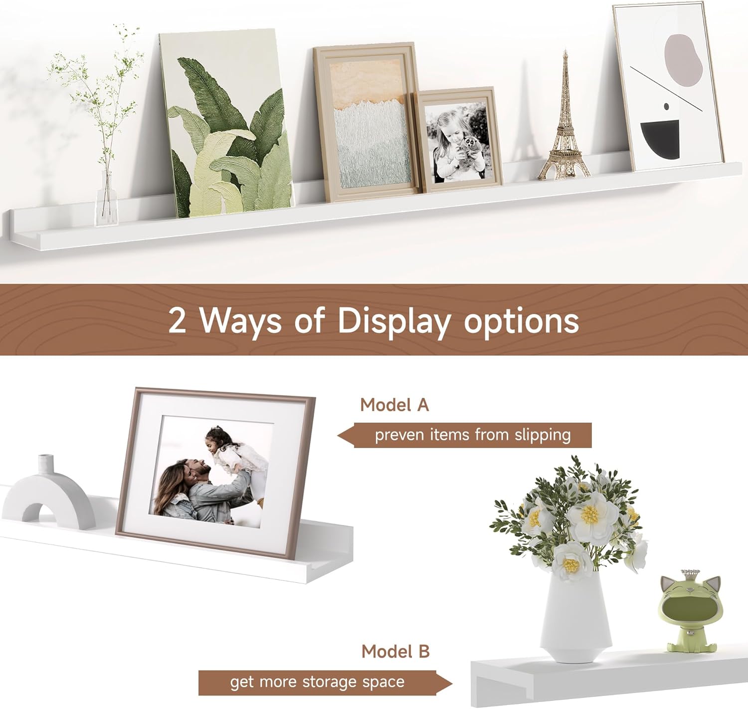 - MEMORIES SHOWCASE SHELF: Do you have a lot of memorable photos, but don't know how to display them, Fun Memories picture ledge shelves (especially in large sizes) are perfect for you to display them! With our hanging racks, you can store and display different types and sizes of photo frames in one place without worrying about