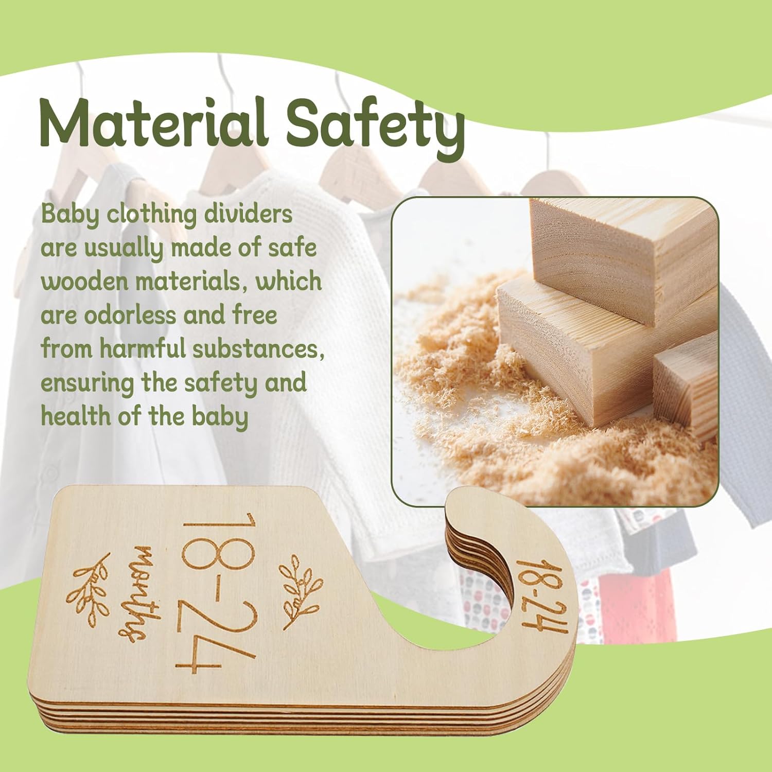 - Double-sided Design: Each baby closet divider is crafted on both sides for easy access to clothing from any angle. The baby closet dividers are made of wood and feature a green pattern and modern lettering, making them both attractive and functional