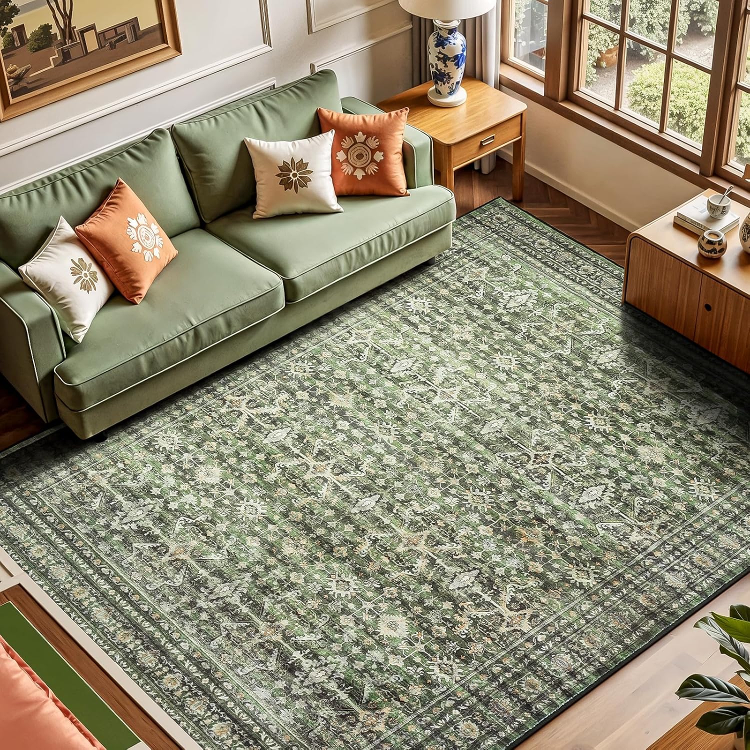 Lofus 5x7 Area Rug for Living Room,Green Washable Area Rugs with Non-Slip Backing,Soft Boho Carpets for Bedroom Dining Room Home Office Indoor Nursery