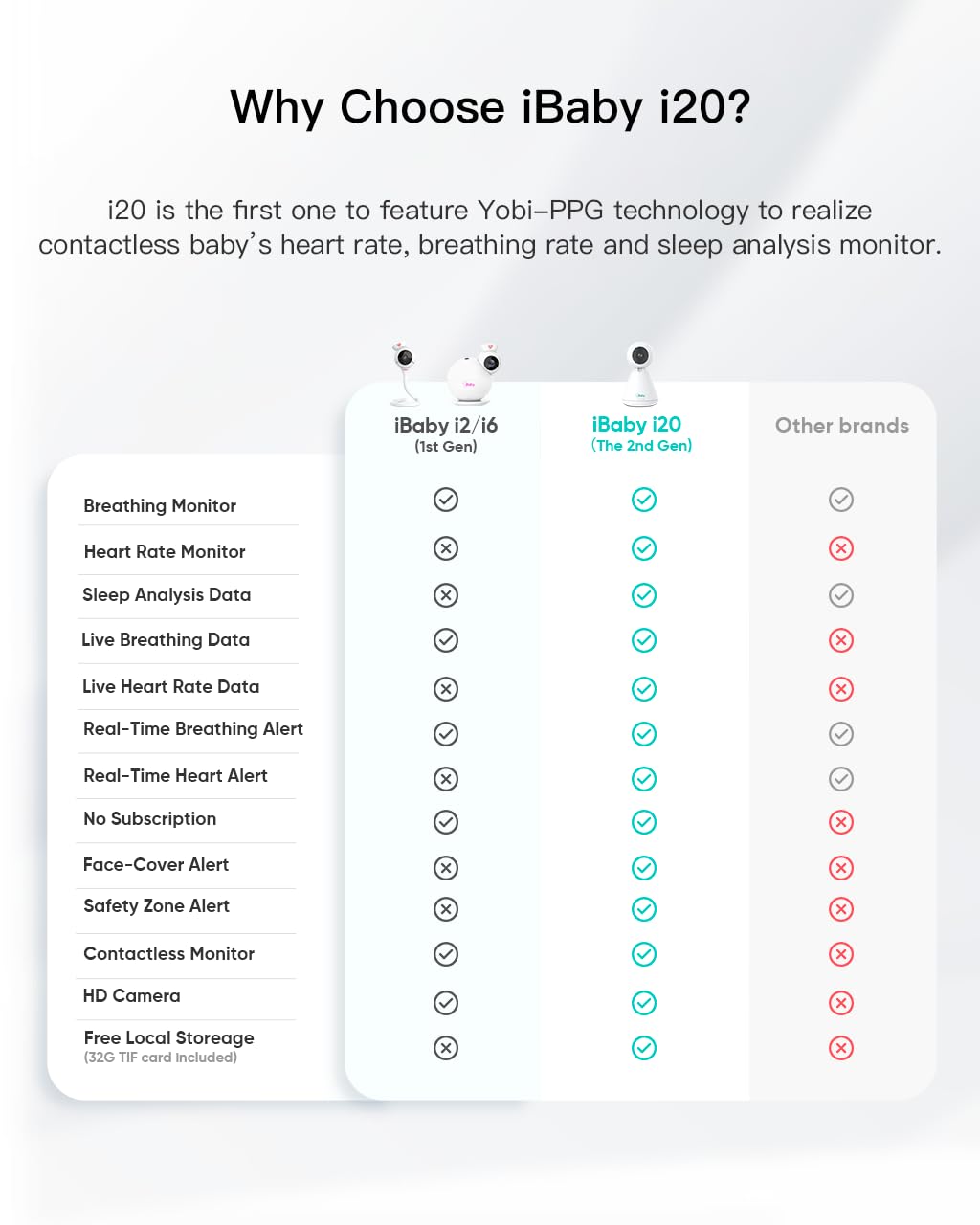 iBaby i20 Smart Baby Monitor & Wall Mount - 1080P Video Camera, Contactless, Monitor Heart Rate, Breathing & Sleep,Sound Machine, No Subscription, 2-Way Audio, Cry & Safety Alerts, Night Vision